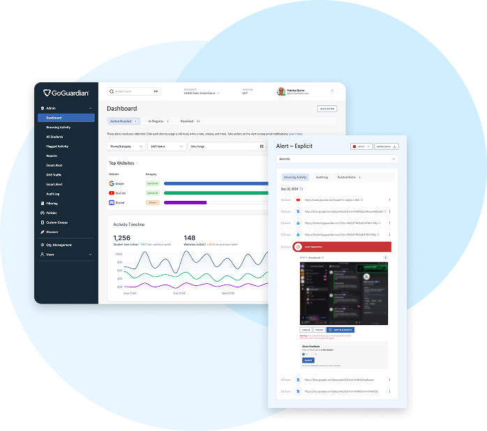 GoGuardian Admin delivers an advanced, AI-powered content filter that unifies student safety, helps ensure compliance, and keeps learning focused across all devices.