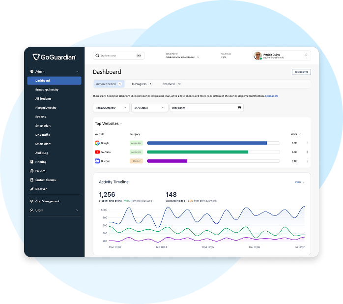 GoGuardian Admin shows how students interact online, so administrators can deliver guardrails that ensure the learning environment is safe, secure, and compliant.