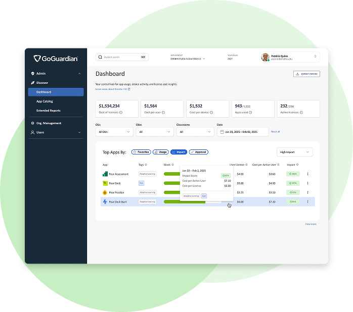 GoGuardian Discover provides the financial signals your district needs to make impactful ROI decisions. It eliminates budget waste and informs strategic contract negotiations with complete edtech utilization metrics.